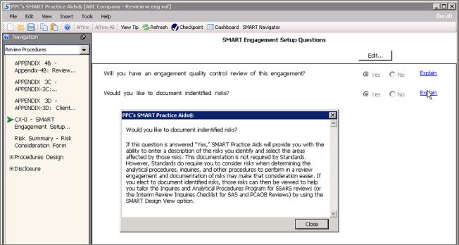 In a Review engagement, if you answer ‘Yes’ to the SMART setup engagement question ‘Would you like to document identified risks?’, SMART Practice Aids will provide you with the ability to enter a description of the risks you identify and select the areas affected by those risks.