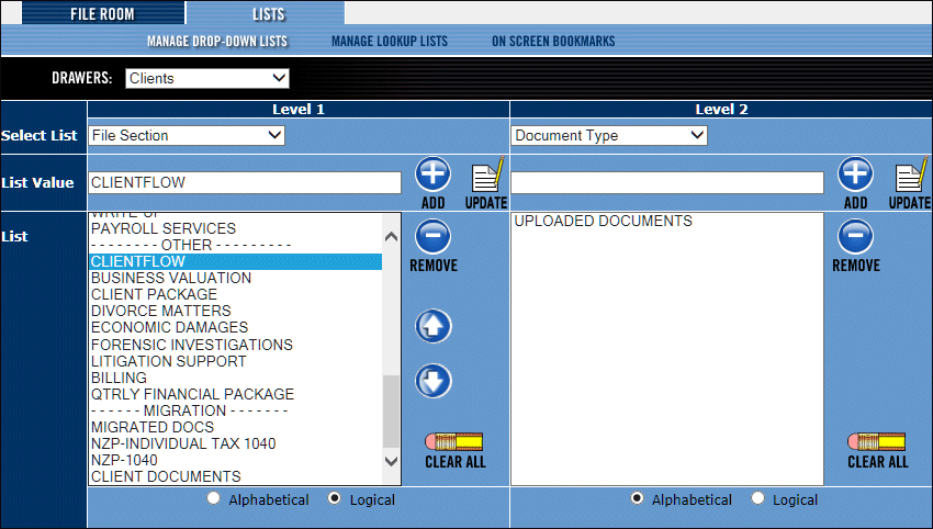 To use ClientFlow properly, GoFileRoom lets you define the items that display in dropdown lists throughout the application.