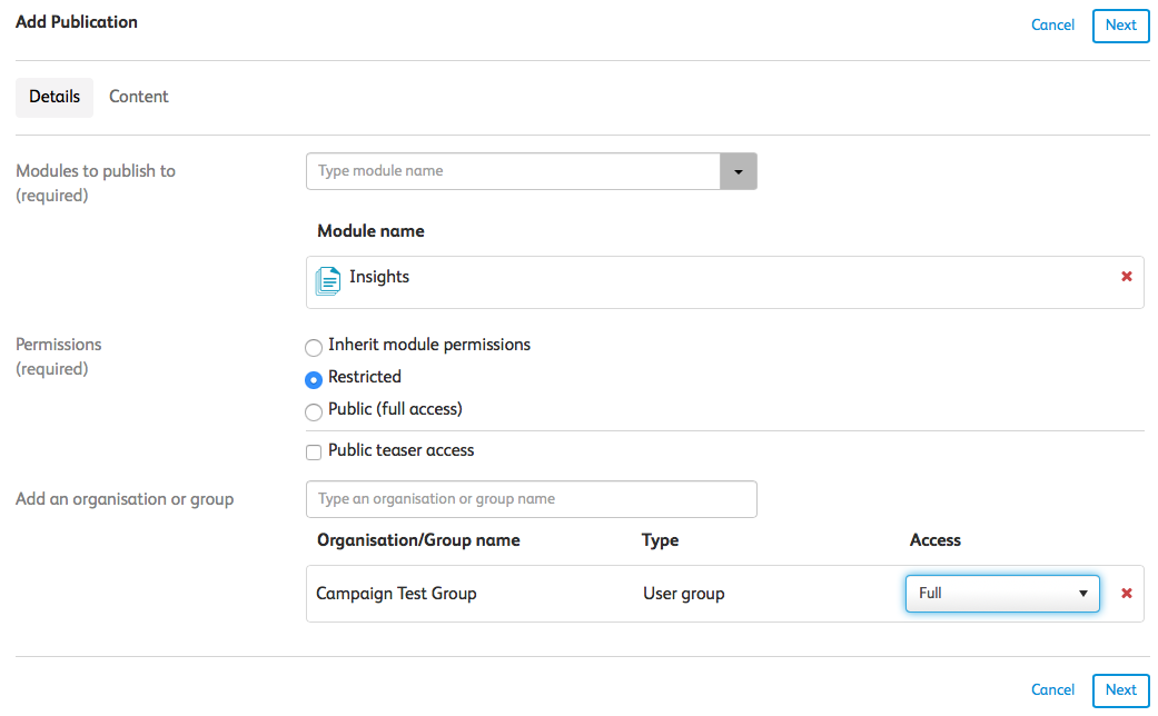 Image | This is the image used next to your publication when you refer to it from other places, for example, from a content list panel in a dashboard. You can also select the Display as hero image checkbox, to display the chosen image as a hero image in the publication. |