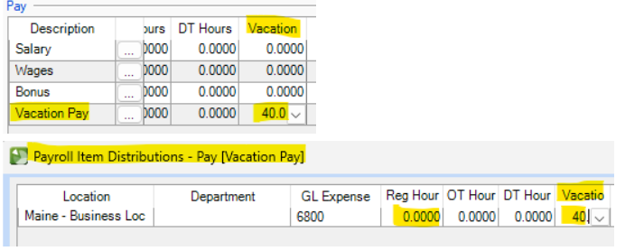4. When entering the payroll checks, find the cell in the grid that corresponds to the correct accruable benefit item. In the following example, 40 hours of vacation is entered in the cell where the vacation row and vacation column intersect. This allows the vacation hours to display on the check stub in the pay section, while still being deducted from the available hours balance.