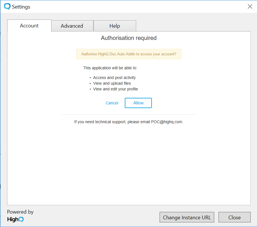 An authorisation screen prompt will display to confirm the changes that have been made. To change the instance URL click on