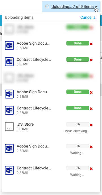 You'll also receive a message detailing how much of the upload is left to do. You can also click the down arrow next to this message, to view the status of each document and folder.