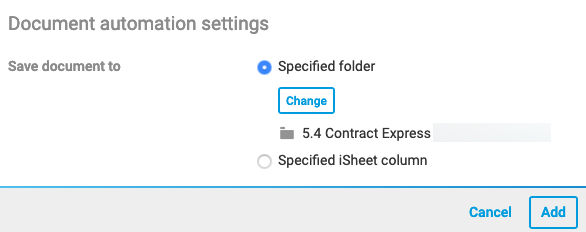 When you create a document from a linked Contract Express template, you may select one or more iSheet records, and then save the generated documents to either a folder in the