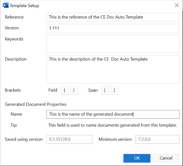 The template name and description, seen in the list of Contract Express templates, dashboard panel or the public access link, are set in the template file.