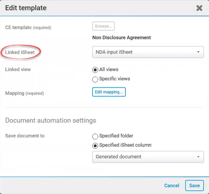 You must 'map' iSheet columns in an 'input iSheet' to the variables required by the document template. This allows you to generate a single document, or a series of documents, from iSheet records.