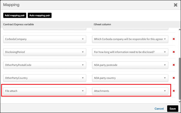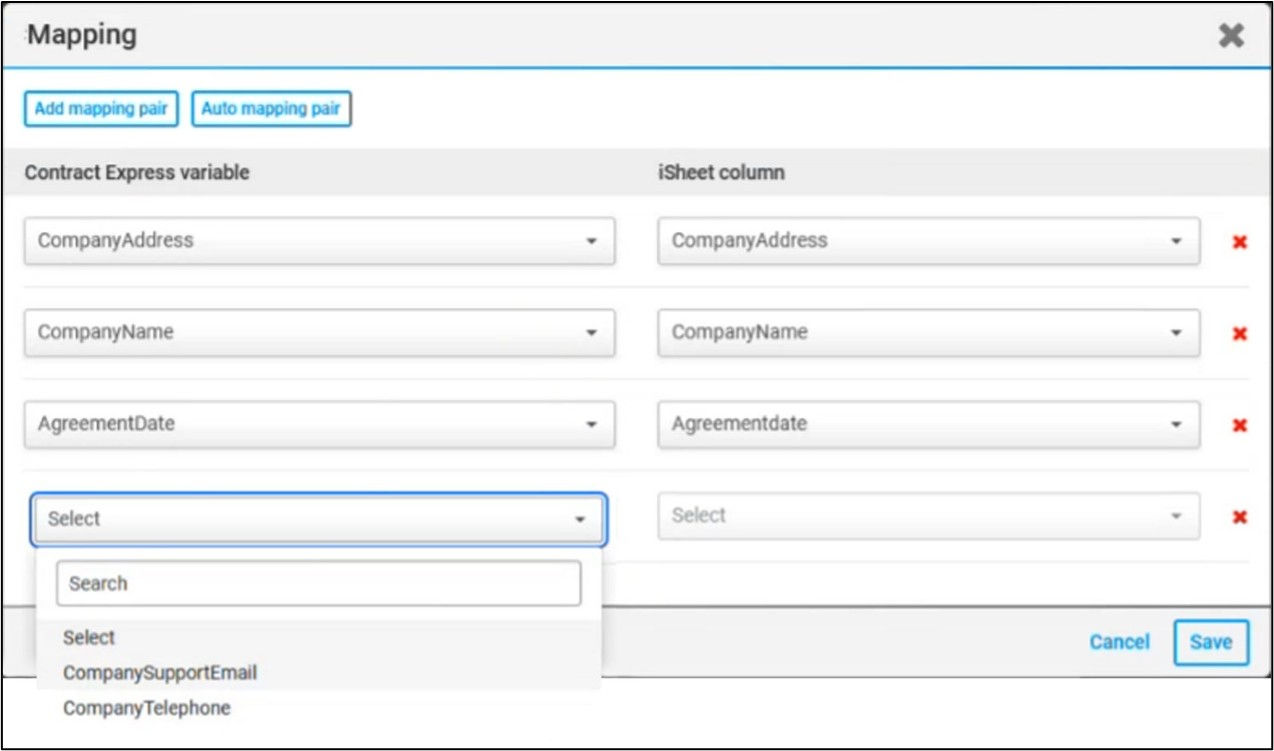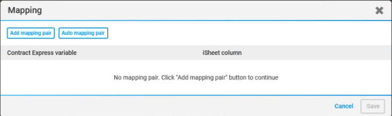 window displays variables from the Contract Express template and the iSheet column mapped to that variable.