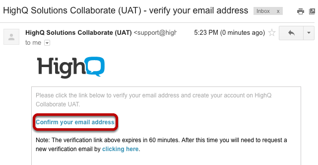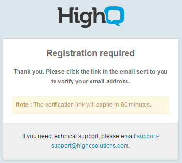 . If it's correct, a confirmation screen is displayed showing a message asking the recipient to use the link in the email sent to them to verify their email address. The verification link expires in 60 minutes.