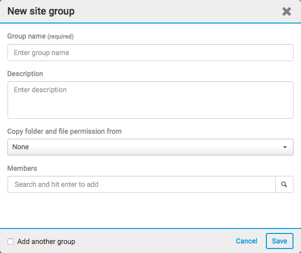 Enter a name for the new group, and optionally enter a group description. If another site is available on your instance, you can copy folder and file permissions. You can also assign existing members to the group in the