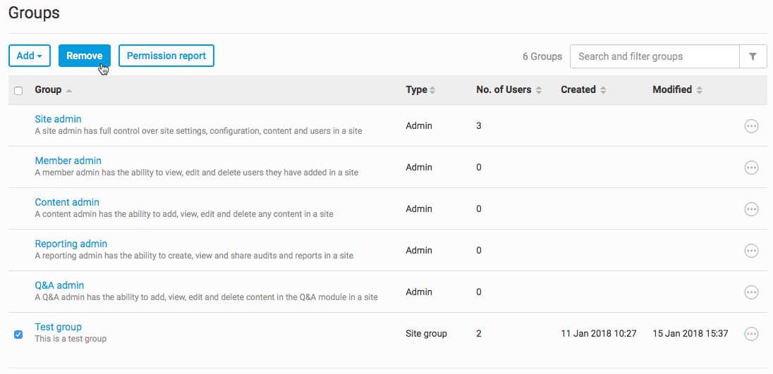 To remove a group, select the checkbox next to the group and select