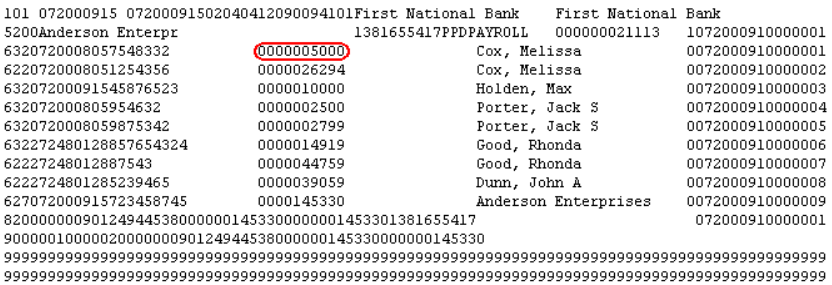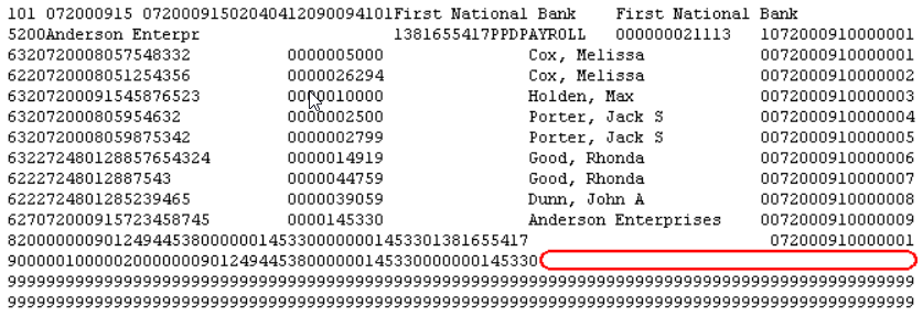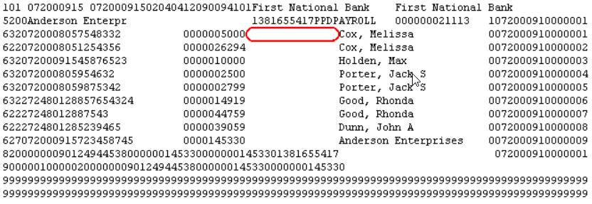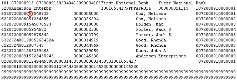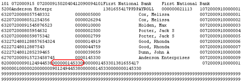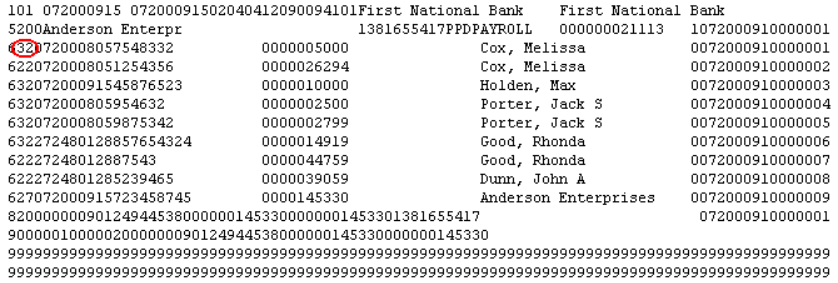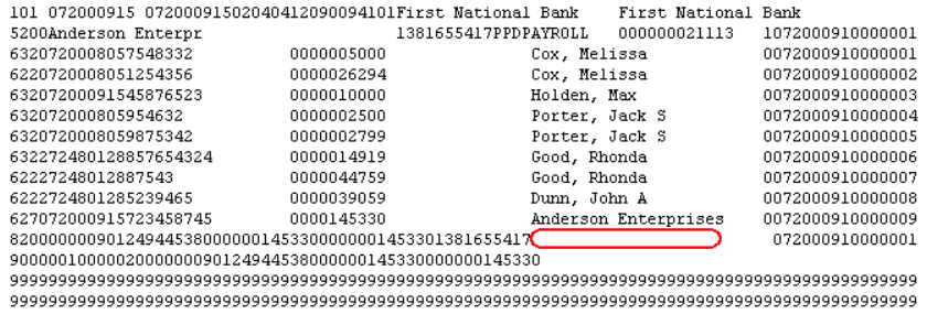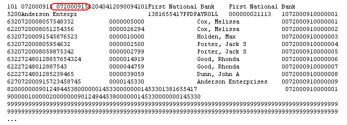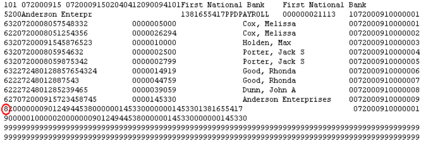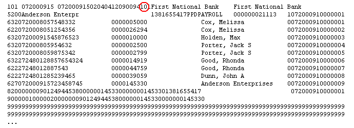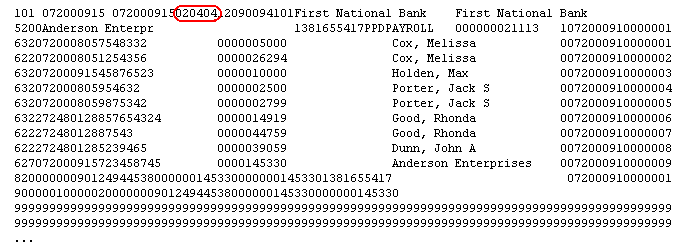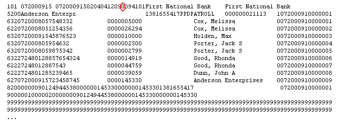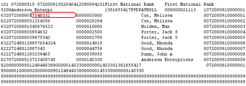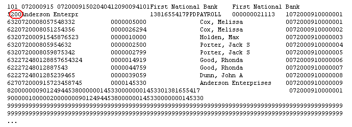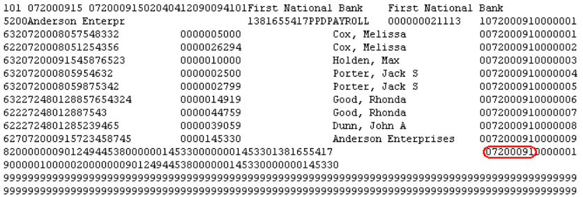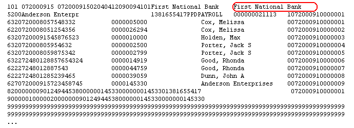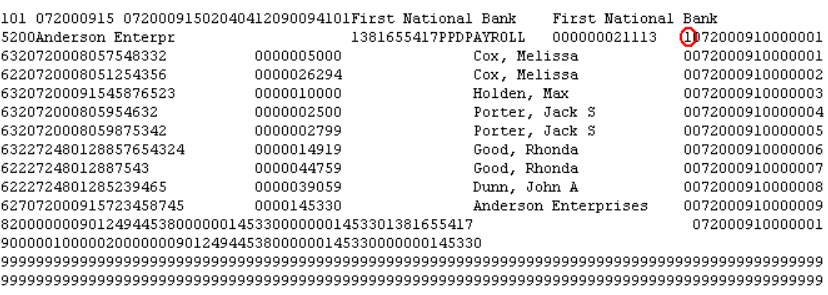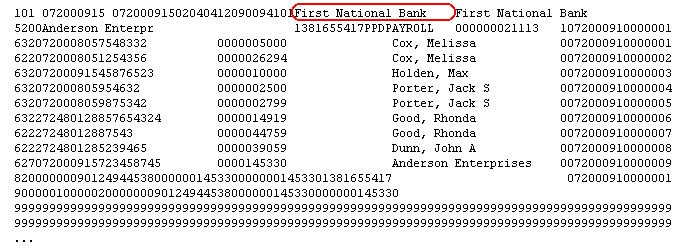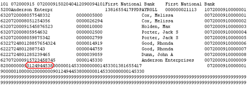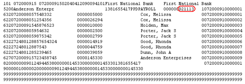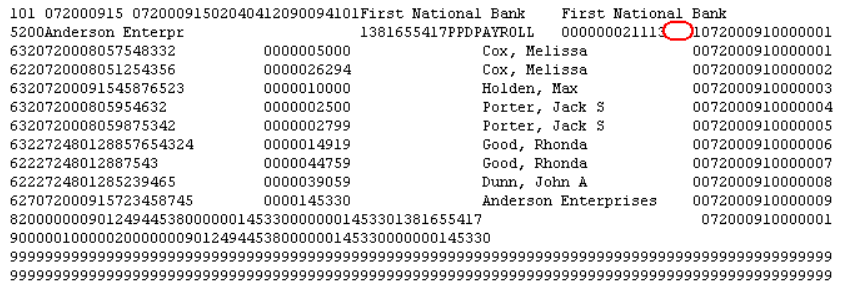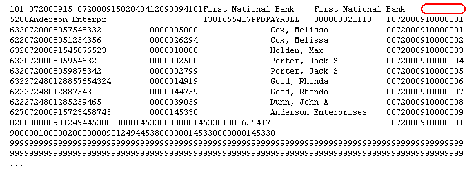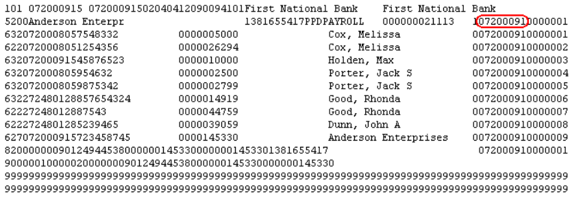 The 1st 8 digits of the 9-digit bank routing number associated with the bank selected for the Originator bank , as entered in the Direct Deposit tab (or the Client Direct Deposit tab, if applicable) of the Bank Accounts screen. (80-87) 8 numeric.![]() |