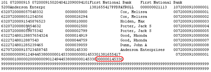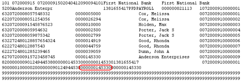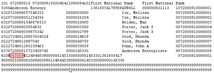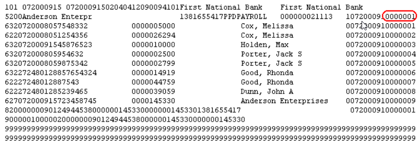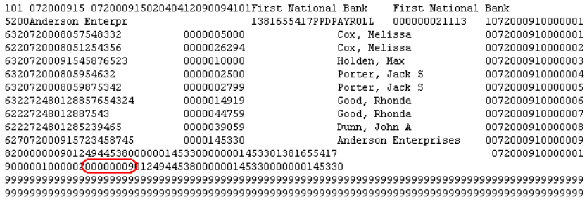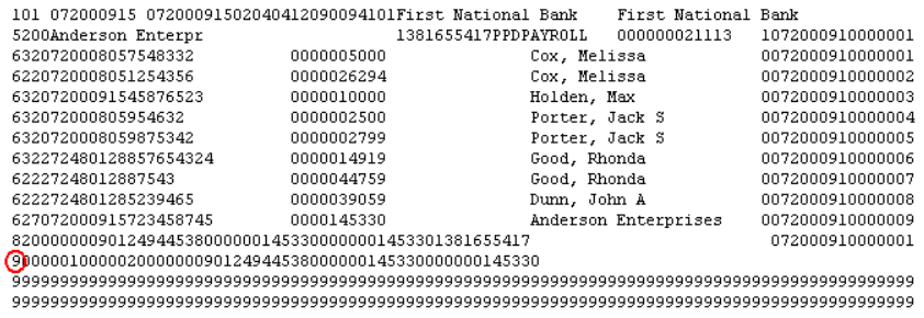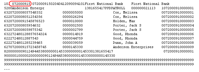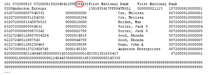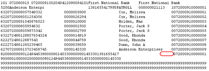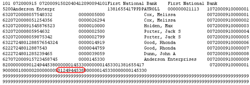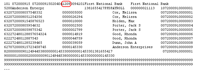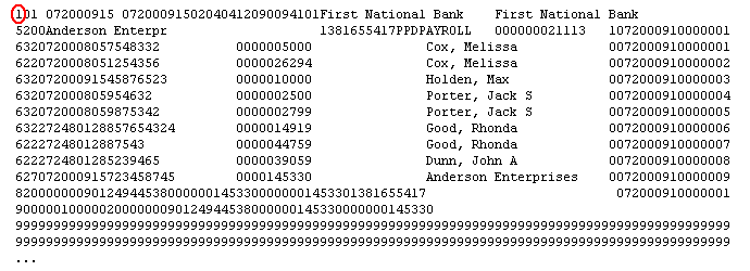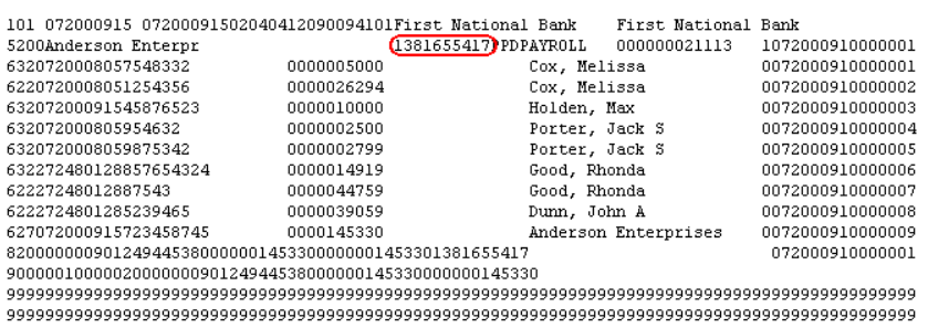The 1st 8 digits of the 9-digit bank routing number associated with the bank selected in Originator Bank , as entered in the Direct Deposit tab (or the Client Direct Deposit tab, if applicable) of the Bank Accounts screen. (80-87) 8 numeric.![]() |