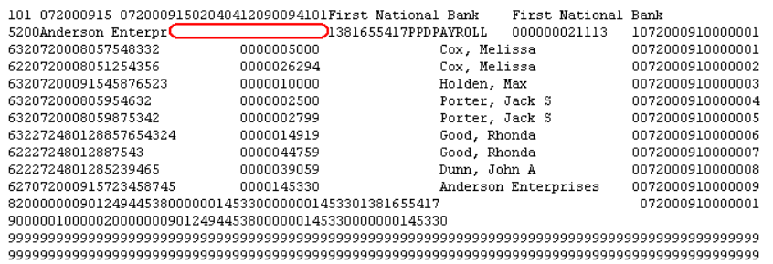 The choice selected for Company Name , as entered in the Advanced setup, accessed from the Direct Deposit tab (or the Client Direct Deposit tab, if applicable) of the Bank Accounts screen. (05-20) 16 numeric.![]() |