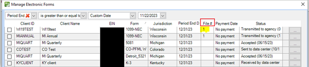 The file number is important so you can know which ReceiptID/SubID is correct. The customer may have filed the client multiple times (adding additional vendors/independent contractors), but the files will start with 1 for each client and increase by 1. In CS Connect, the file number shows after the period date.