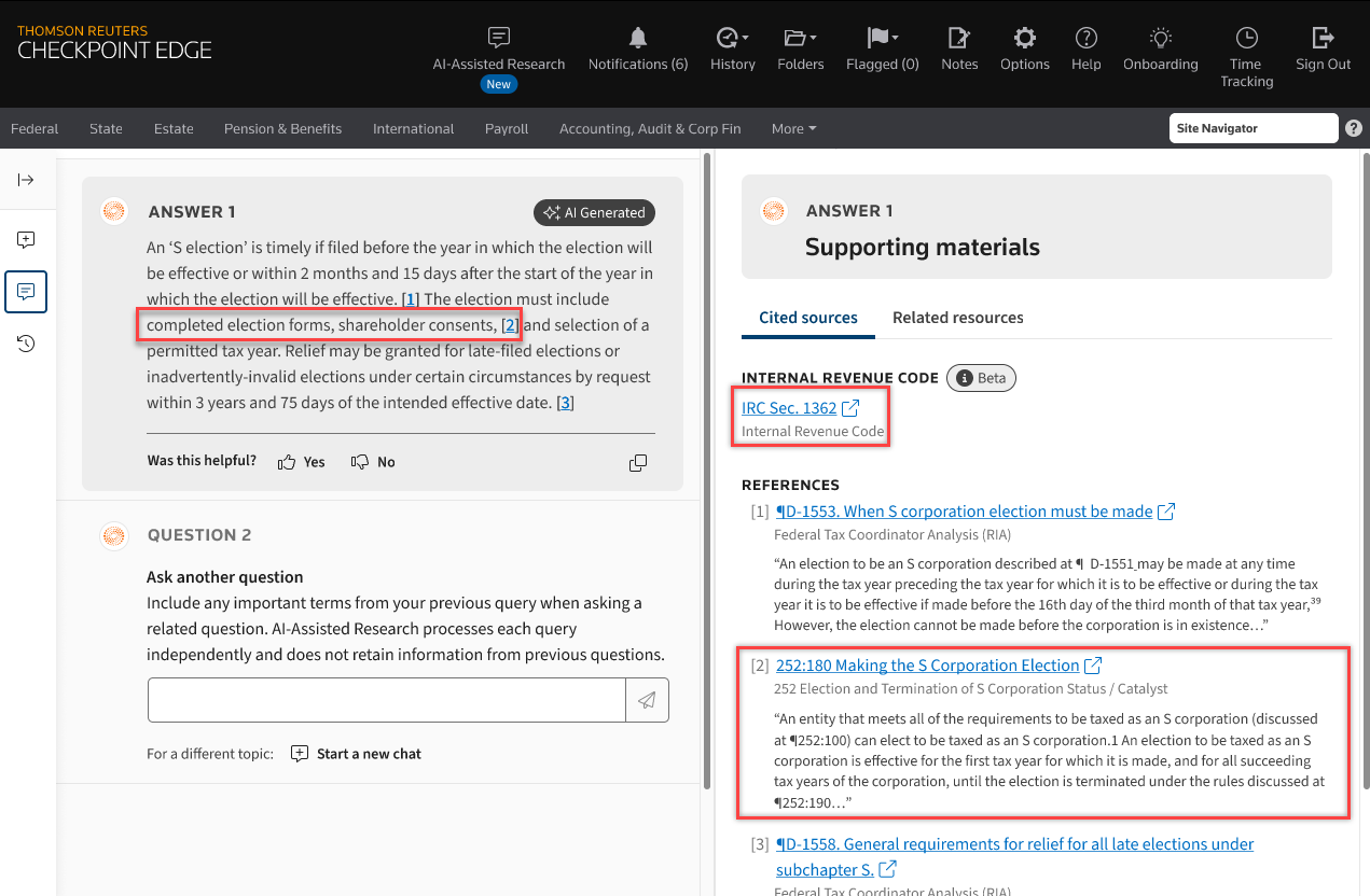 AI-Assisted Research is a large language model (LLM), chat-based interface in Checkpoint Edge. You can ask federal tax questions and get AI-generated answers based on Checkpoint content and sources.