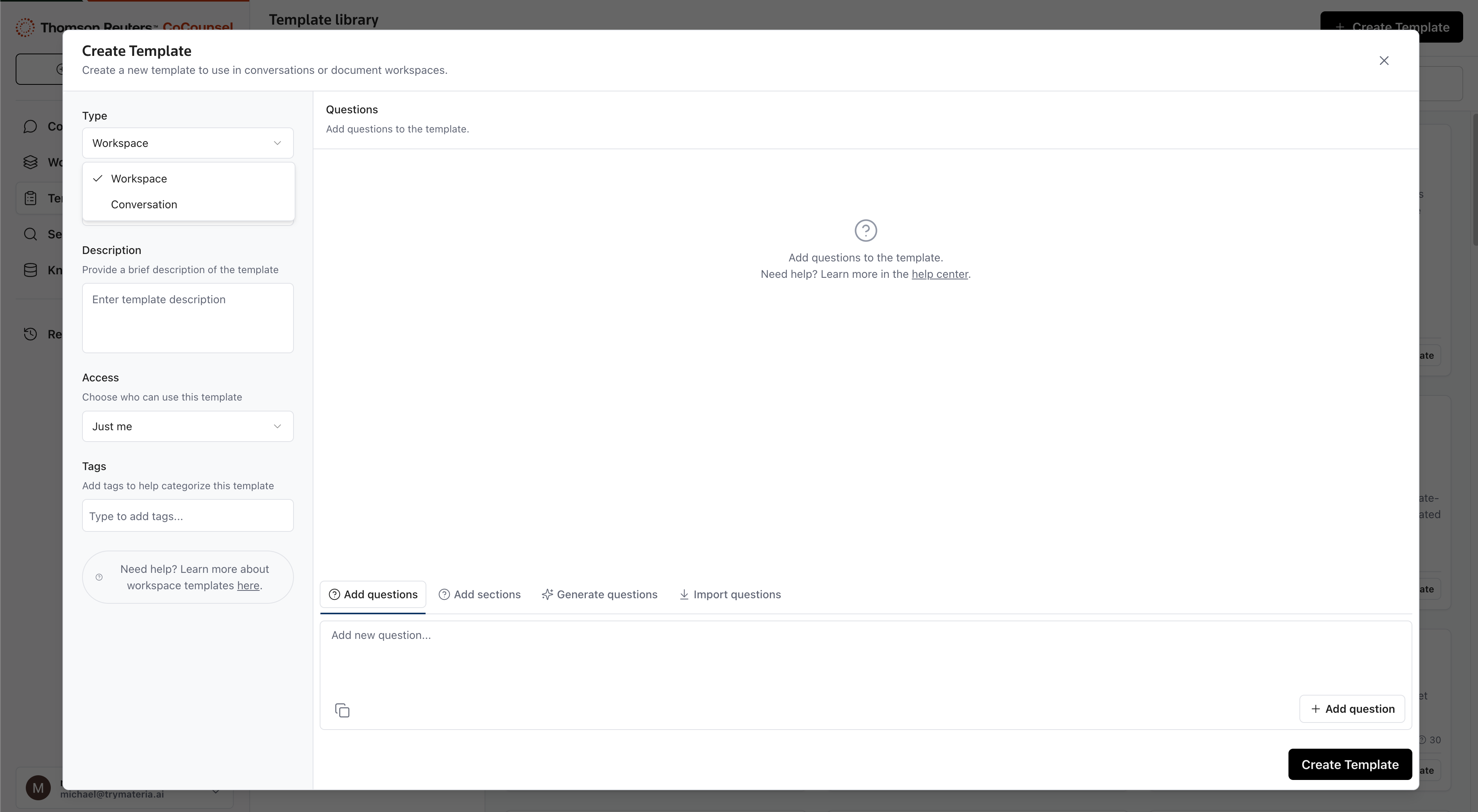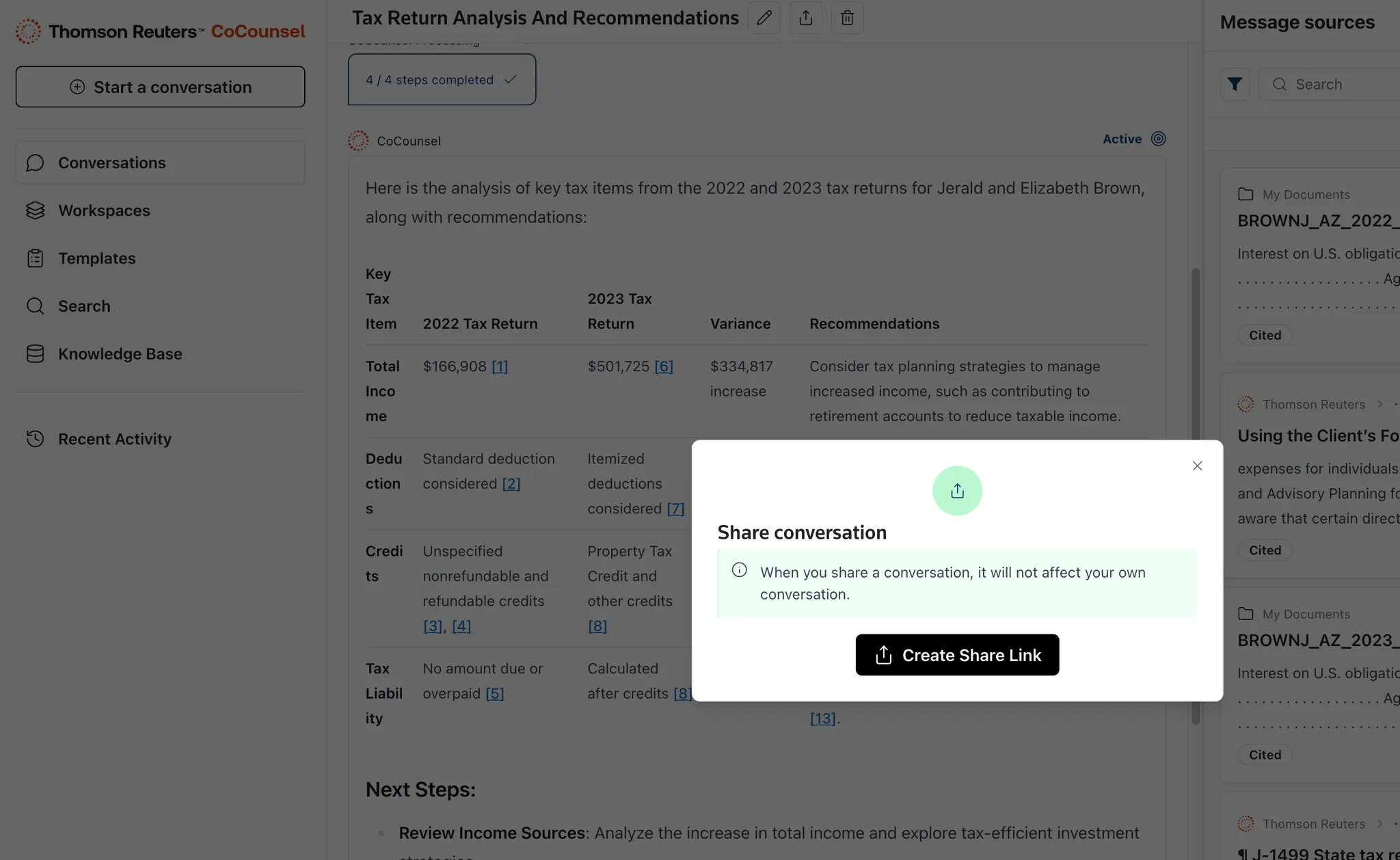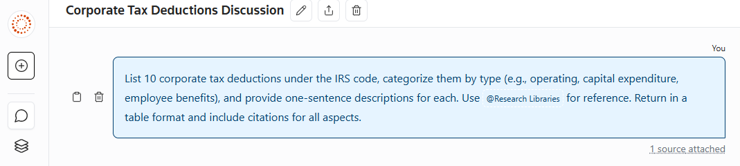 Conversations bring together all of CoCounsel's capabilities, letting users integrate authoritative research from Checkpoint, internal firm documents, client documents, and the broader Knowledge Base. Conversations are ideal for applied research use cases. They also serve as a space for drafting memos, emails, and reports based on the information gathered.