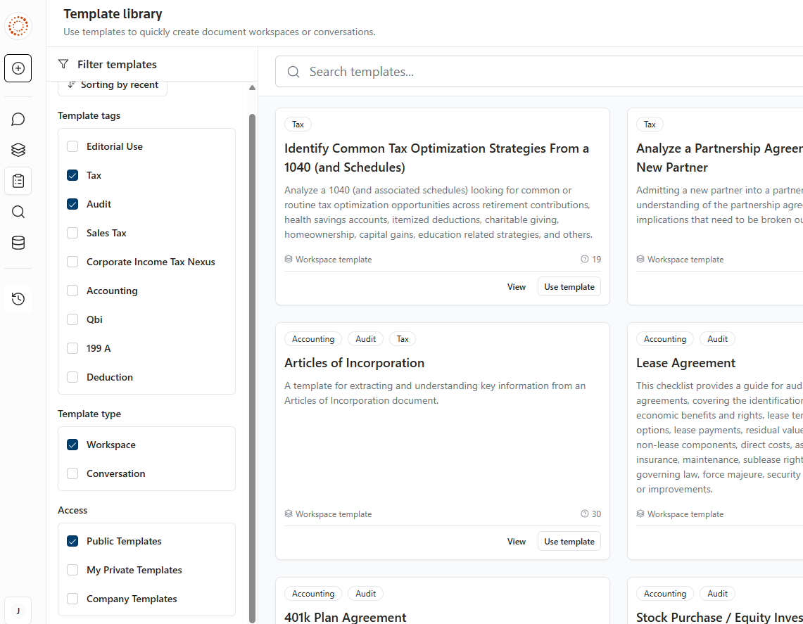 Workspaces help organize and interpret documents by breaking them down into structured insights that are easy to review. Workspaces focus on making information easier to digest and apply. They are especially useful for organizing multiple documents, identifying key provisions, and standardizing document review processes.