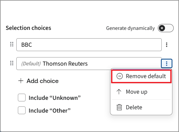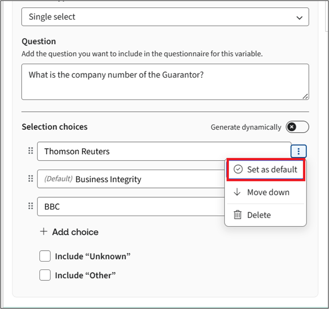 Text selection variables now support setting default choices. To set a default option for any text selection variable, click