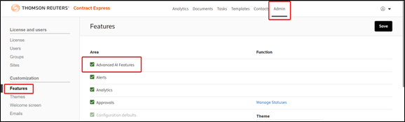 To access these features, an administrator of your license space will need to enable the “Advanced AI Features” setting in the Admin tab of your license under Features. They will be prompted to consent to the use of artificial intelligence (AI) technology for the purpose of analysing and processing your documents.