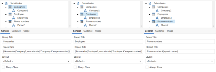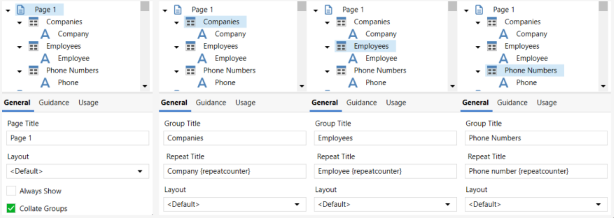 In the example below, the nested groups are in a page that is collated and the Repeat titles for the groups Companies, Employees and Phone Numbers are left blank:
