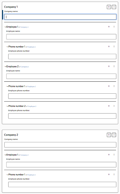 The questionnaire group titles will display in the questionnaire as “Company 1”, “Employee 1 of Company 1” and “Phone number 1 of Employee 1” for the first repetition of the respective repeated groups.