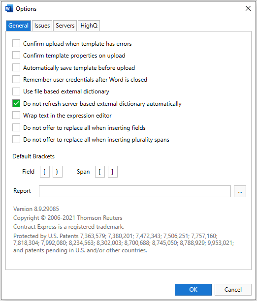 , either local or on a shared server, and not necessarily to uploaded templates in the Contract Express template repository. When a template is opened, Author looks for these external dictionaries at the specified locations and tries to open each in turn. It then copies out the variables, warnings, and lookup tables from the external dictionary and stores a