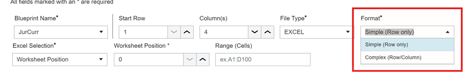 Once Complex (Row/Column) is selected, the Start Row and Columns get disabled and Range and new field called, Begin Row get displayed as mandatory fields.