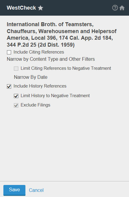 Limits for Date, Content Type, Depth of Treatment and other filters are only applied to positive Citing References included in your WestCheck report. Negative Treatment can be limited by date.