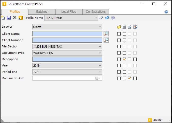 In this example, a staff member of the firm works on numerous 1120S returns in their role at the firm. In the following example profile, the staff needs only to add the client name/ID as they index, without the need to index all fields in the profile.