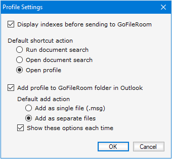 Because the default profile is set to Send to GoFileRoom when the GoFileRoom ControlPanel is installed with the GoFileRoom Add-In, you'll need to make the following changes in the Profile Settings dialog as follows.
