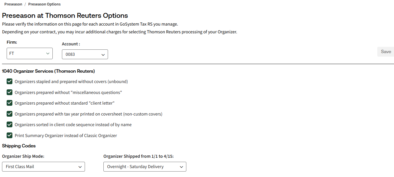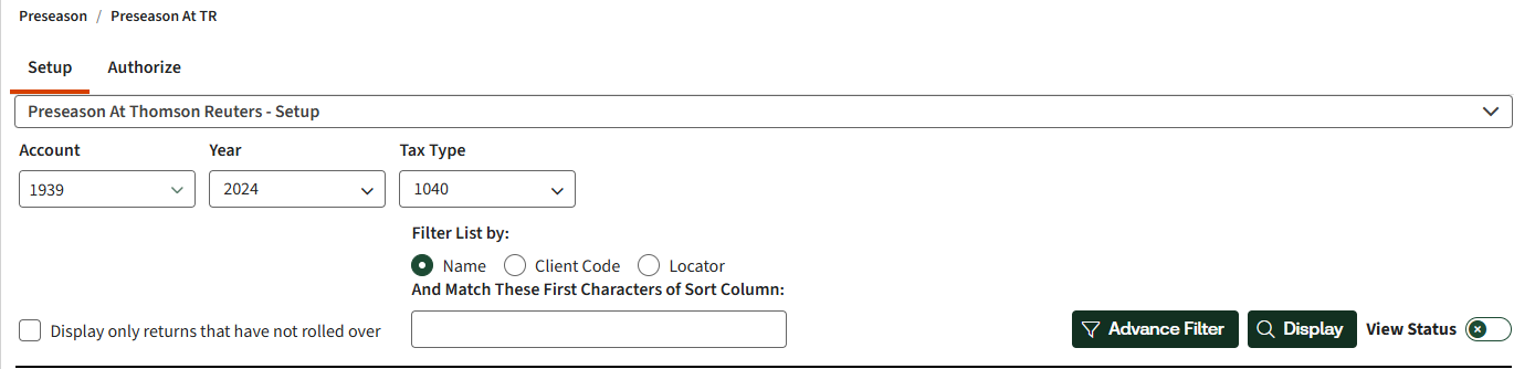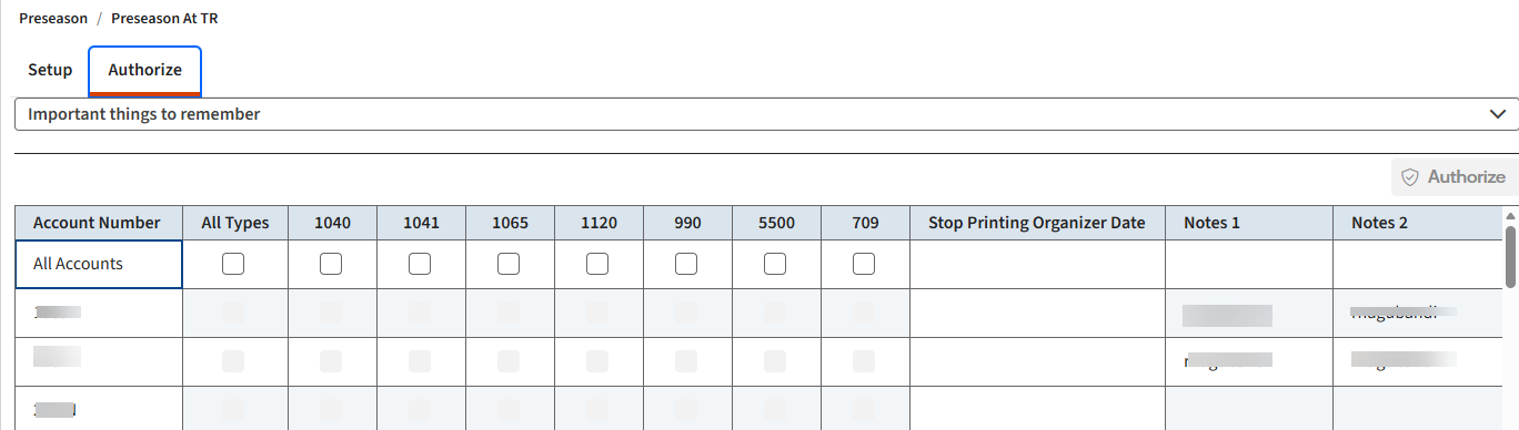 Select accounts and return types that are ready for preseason processing. Once you authorize an account/return type, Thomson Reuters begins rolling over returns and printing Organizers.