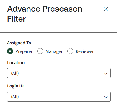 • You can also add Advance Preseason Filters to select returns assigned to preparer, manager, or reviewer or certain locations or by login id.