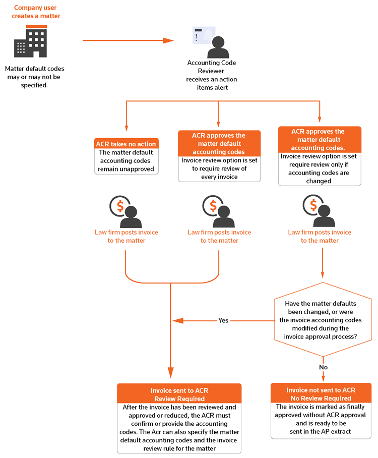 The ACR can approve the matter default accounting codes set by the matter creator, or can specify new codes. In addition, the ACR can define a rule requiring accounting code review of every invoice posted to the matter.