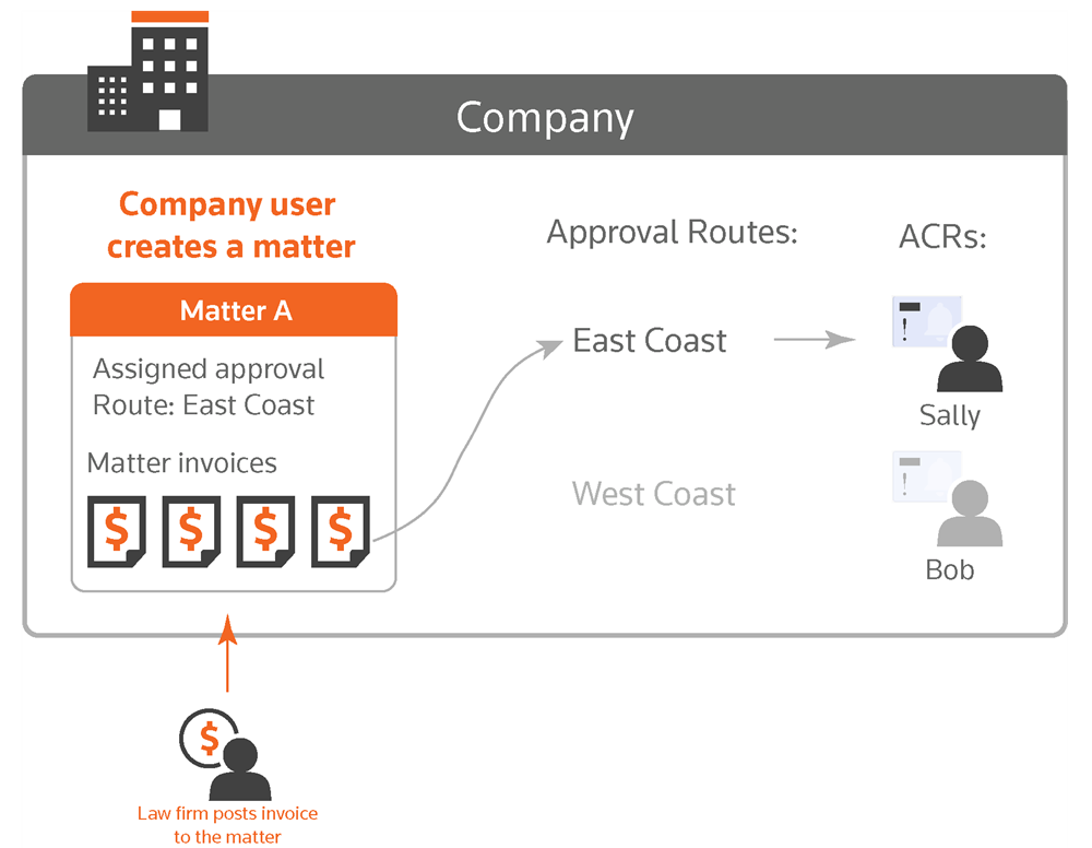 Sally is the ACR for the invoice approval route East Coast. If East Coast is selected as the approval route for matter A, Sally is responsible for the accounting codes for matter A and all invoices posted to matter A.