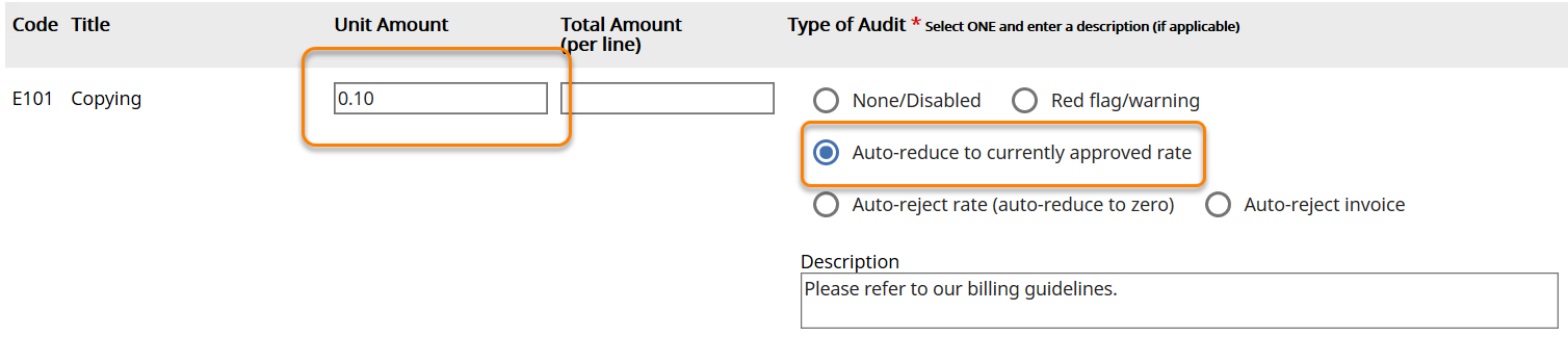 In the following example, Tracker will automatically reduce any invoice with a per-unit copying charge that exceeds ten cents per unit back to ten cents.