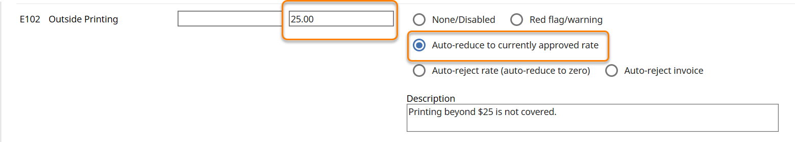 In the following example, the limit for outside printing would be $25, so Tracker will automatically reduce any invoice with a line item total for outside printing that is more than $25.