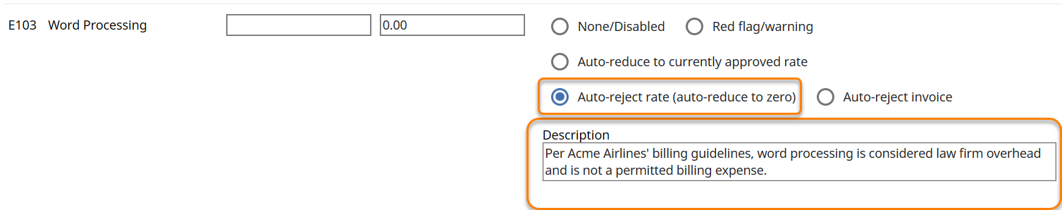 Tracker can flag, reduce, or reject any LEDES invoices that contain expenses that violate your guidelines. When you set up audit sets, you can:
