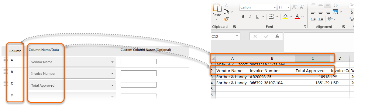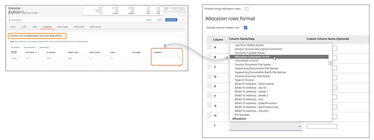 Allocation rows format | Include Column Header Row : If you select this option, there will be a header row before the section of the invoice spreadsheet that contains the standard rows. There will be 1 standard row header for each invoice spreadsheet. For single-row format, the standard rows follow the standard row header, and the standard rows are contiguous in the invoice spreadsheet. There is 1 standard row for each invoice included in the invoice spreadsheet. When using enhanced (mode) accounting code allocations, the allocation row information from invoices is only output in the allocation rows. Unlike simple (mode) accounting code allocations, the standard row doesn’t include any invoice accounting code allocation content. The column choices don’t reference specific allocation rows. Instead, you select columns for: accounting code types, allocation percentage, allocation amount, and comment. The spreadsheet that is produced will contain an allocation row for every allocation row for all the included invoices. Column corresponds to the columns in your spreadsheet. Column Name/Data corresponds to the information that will appear in that column. When you specify an option, a list appears. Scroll through the list to locate the value that corresponds to your column. When you select an option, a new column option appears. |