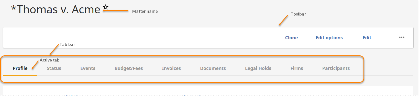 Tabs provide access to additional information for matters and invoices, such as documents that are attached to a matter or audits that must be resolved for invoices. The active tab is indicated by an orange underline.
