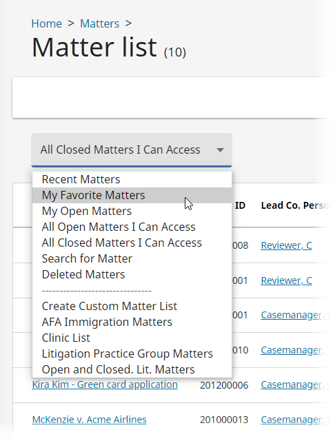 For example, the dropdown on the Matter list page lets you select which matters to show. Selecting