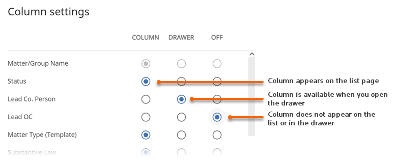 1. On the Column Settings dialog, select the fields you want to show. You can select from a list of possible columns and indicate whether the columns appear on the list page or only in the drawer:
