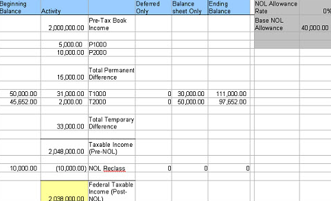 When the NOL Allowance Rate is set to 0% and the Base NOL Allowance is set to 40,000, the NOL Reclass is the total NOL Beginning Balance (10,000), because you cannot use more NOL than you have in the beginning balance.
