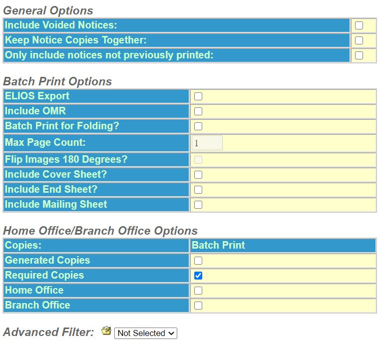 • Batch Print Options - This section applies to all notices that are notices to be sent to a folding machine.