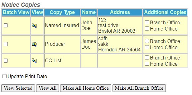 Make All Branch Office - This option is to view and print notice copies and label them as Branch Office copies.