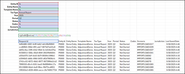 EXTDCGetList (Output Range, Entity ID, Entity Name, Template Name, Tax Type, Year, Period, Status, Codes, Scenario, Jurisdiction, Client Name, Client Number ) | DCGetList (Output Range, Entity ID, Entity Name, Template Name, Tax Type, Year, Period, Status, Codes, Scenario, Jurisdiction, Client Name, Client Number ) |