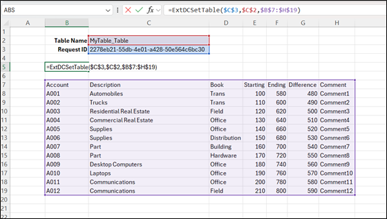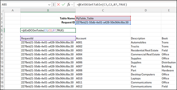 =EXTDCGetTable(Request ID Range, Range Name, Output location, Include Headers) | =DCGetTable(Request ID Range, Range Name, Output location, Include Headers) |