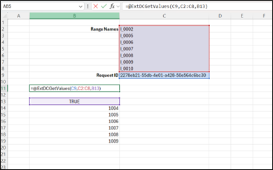 =EXTDCGetValues(Request ID Range, Range Names, Output location, Horizontal Output) | =DCGetValues(Request ID Range, Range Names, Output location, Horizontal Output) |