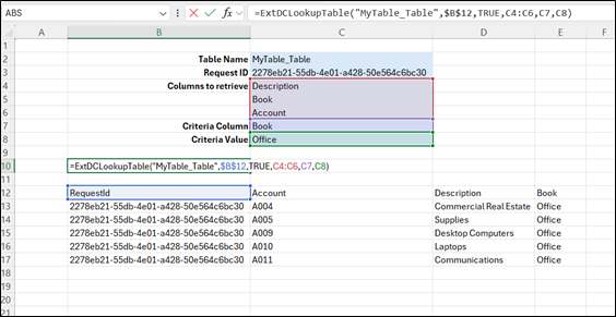 =EXTDCLookUpTable(Request ID Range, Table Name, Output location, Include Headers, Columns to retrieve, Criteria Column, Criteria Value) | =DCLookUpTable(Request ID Range, Table Name, Output location, Include Headers, Columns to retrieve, Criteria Column, Criteria Value) |