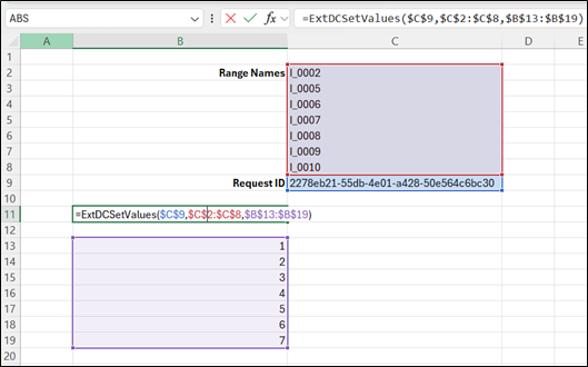 =EXTDCSetValues(Request ID Range, RangeName range,Values Range) | Not available |