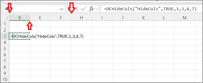 =DCHideCol(WorksheetName, Column, Hide, Column Count)