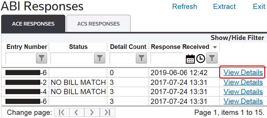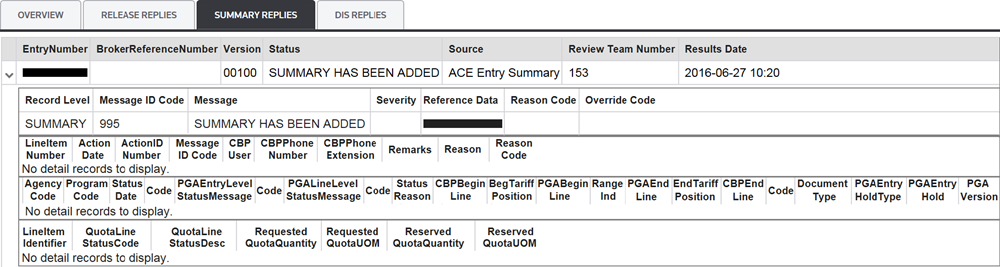 To view more information on the reply, click the arrow to the left. The Record Level, Message ID Code, Message, Reference Data and more detailed information from CBP (if provided) will appear here.
